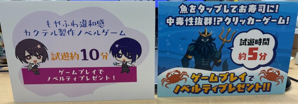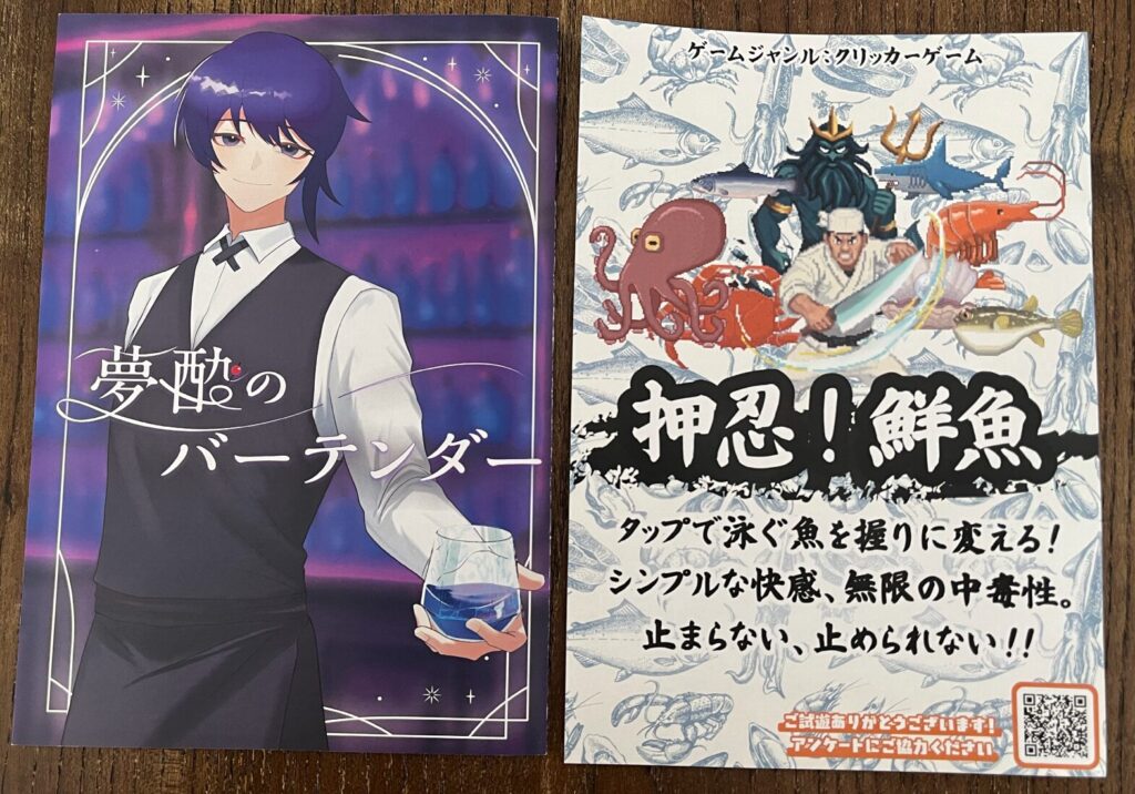 今回出展したのは、もやふわノベルゲーム「夢酔のバーテンダー」と爽快クリッカーゲーム「押忍!鮮魚ークリッカーゲーム-」の2作品です。
